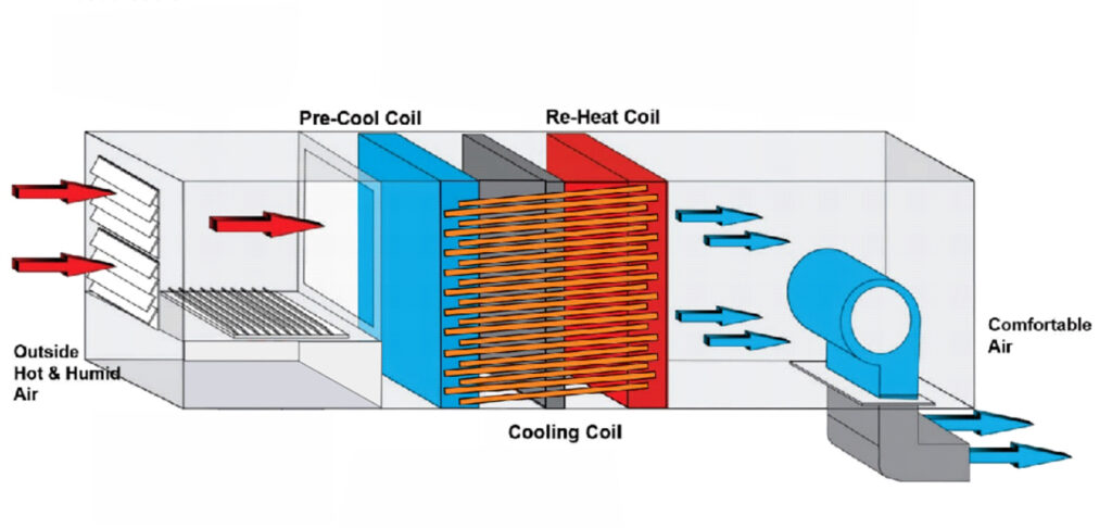 Warm, humid air cools via sensible heat absorption before the active coil. This boosts latent (moisture) removal without extra chiller load—enabling deeper dehumidification.