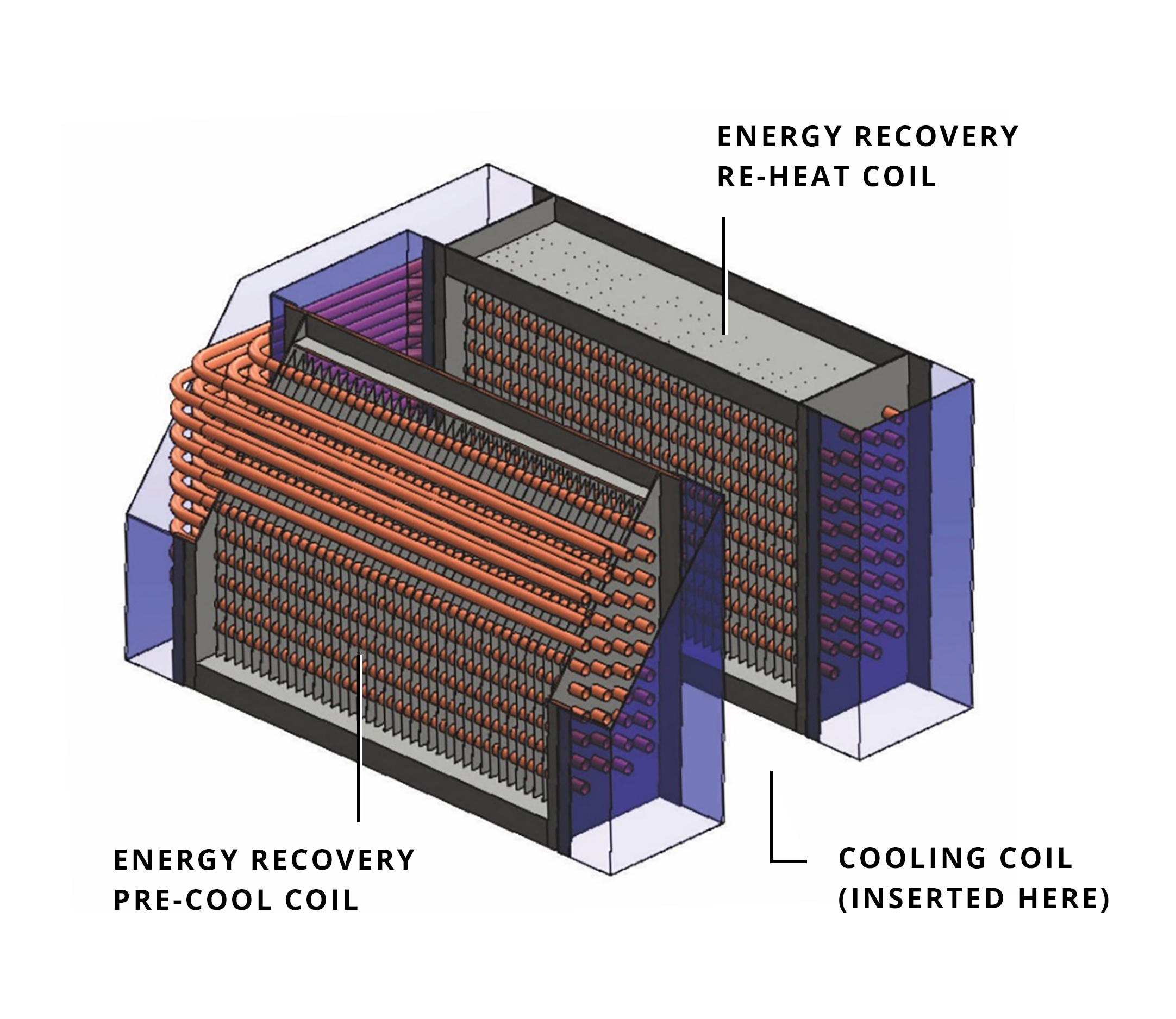 Recovered heat reheats air to neutral temperature post-cooling, eliminating electric, steam, or hot-water reheat.